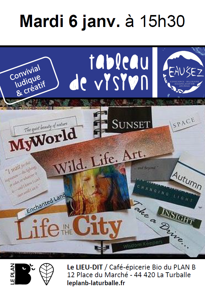 Alors rejoignez-nous au Plan B, pour cet atelier où nous élaborerons ensemble votre tableau de vision personnalisé. Vous l’emporterez ensuite chez vous pour laisser l’énergie faire son chemin au creux de votre vie pour co-créer votre cheminement avec elle !