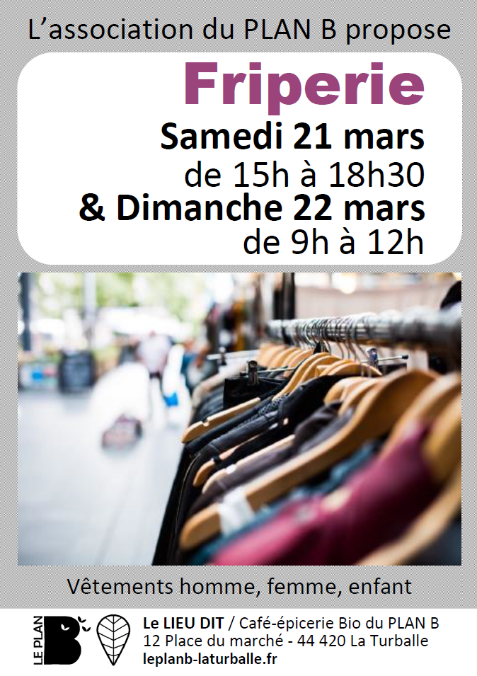 – Vente le 21/03 et le 22/03 à petits prix au profit de l’association du PLAN B,