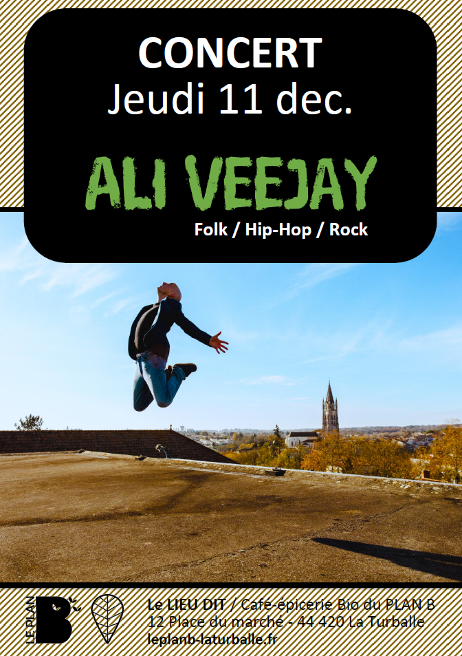 Avec une centaine de concerts au compteur sur le grand ouest, Ali Veejay propose un concert fort, mettant l’accent sur le lien public-artiste. Ballades à fleur de peau y côtoient des morceaux énergiques, le tout lié avec humour par des anecdotes décalées et humaines. Son spectacle est porté par des textes à l’écriture ciselée et un univers saisissant, entre chanson folk, reggae et slam organique.